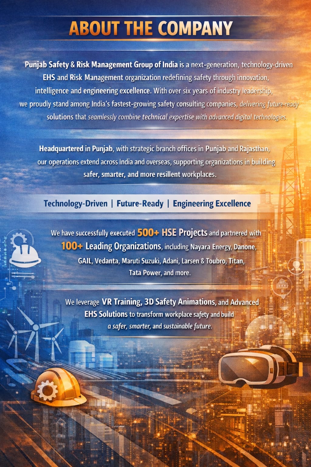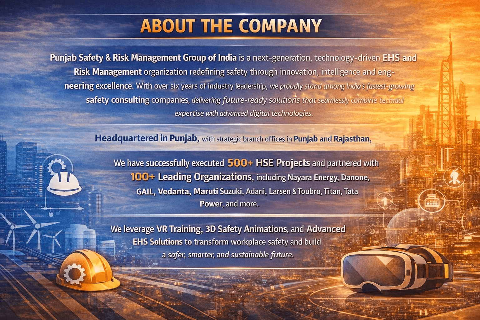 Punjab Safety Group delivers end to end Environment, Health & Safety (EHS) solutions - helping organizations prevent risks, ensure compliance, and build a strong safety culture through training, audits, and innovative technologies.